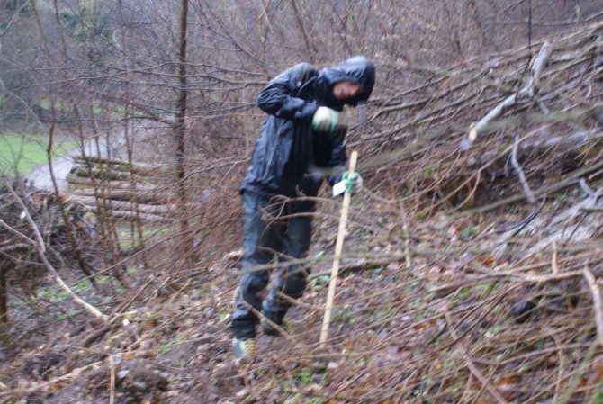 Zur Vorbereitung der Bepflanzung des Waldrandes mit Heckensträucher setzten sie zusammen mit und unter Anleitung von Landschaftsgärtner Patrick Reck Pfähle mit Etiketten der jeweiligen Sträucher, die am morgigen Umwelttag gepflanzt werden.