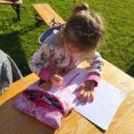 Die Kinder tauchen bewegt und an der frischen Luft, in die bunte, grosse Welt der Buchstaben und Zahlen ein. Sie sammeln und zählen z.B. Kastanien, um daraus ihre eigenen Rechnungen zu generieren, gerade so, wie es für sie passt. Jedes Kind hat sein eigenes «Bauwagen-Buch» = Logbuch. Sie tragen jeden Tag stolz ihre Erlebnisse ein. Dieses Buch, diese Einträge von unseren Erlebnissen und dem, was sie daraus mitgenommen haben, sind ihnen in den ersten Schulwochen schon wichtig und lieb geworden. So kommt es vor, dass sie sich daran erinnern, wenn die Zeit mal knapp ist, sie sollten doch noch ihre Einträge schreiben. So werden die Kinder auch nach den Herbstferien zurückblicken können, was sie erlebt haben und welche Schritte sie schon wieder gemacht haben.