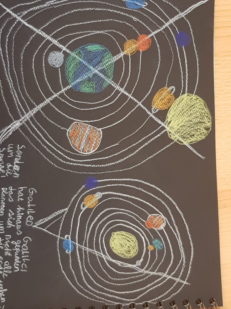 Begonnen haben wir mit dem Sonnensystem und mit Fragen wie; „warum sehen wir Sonne und Mond gleich gross, obwohl sie es nicht sind?“ Dann machten wir uns auf die Suche nach Grössen und Distanzen. Um dies zu Versinnbildlichen, haben wir folgende Fotos geschossen… Dann beschäftigte uns Galileo Galilei mit seinem Heliozentrischen System. Mit Paige schauten […]